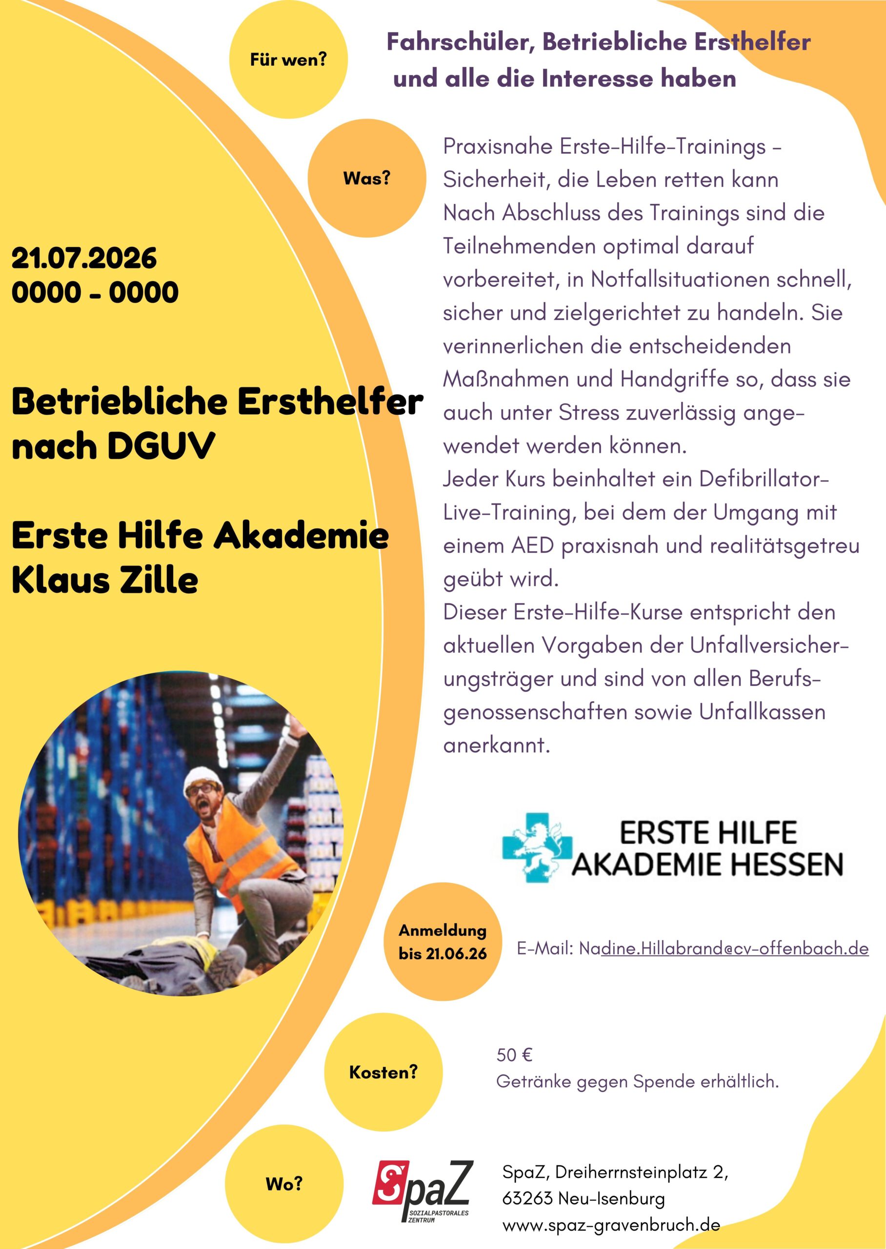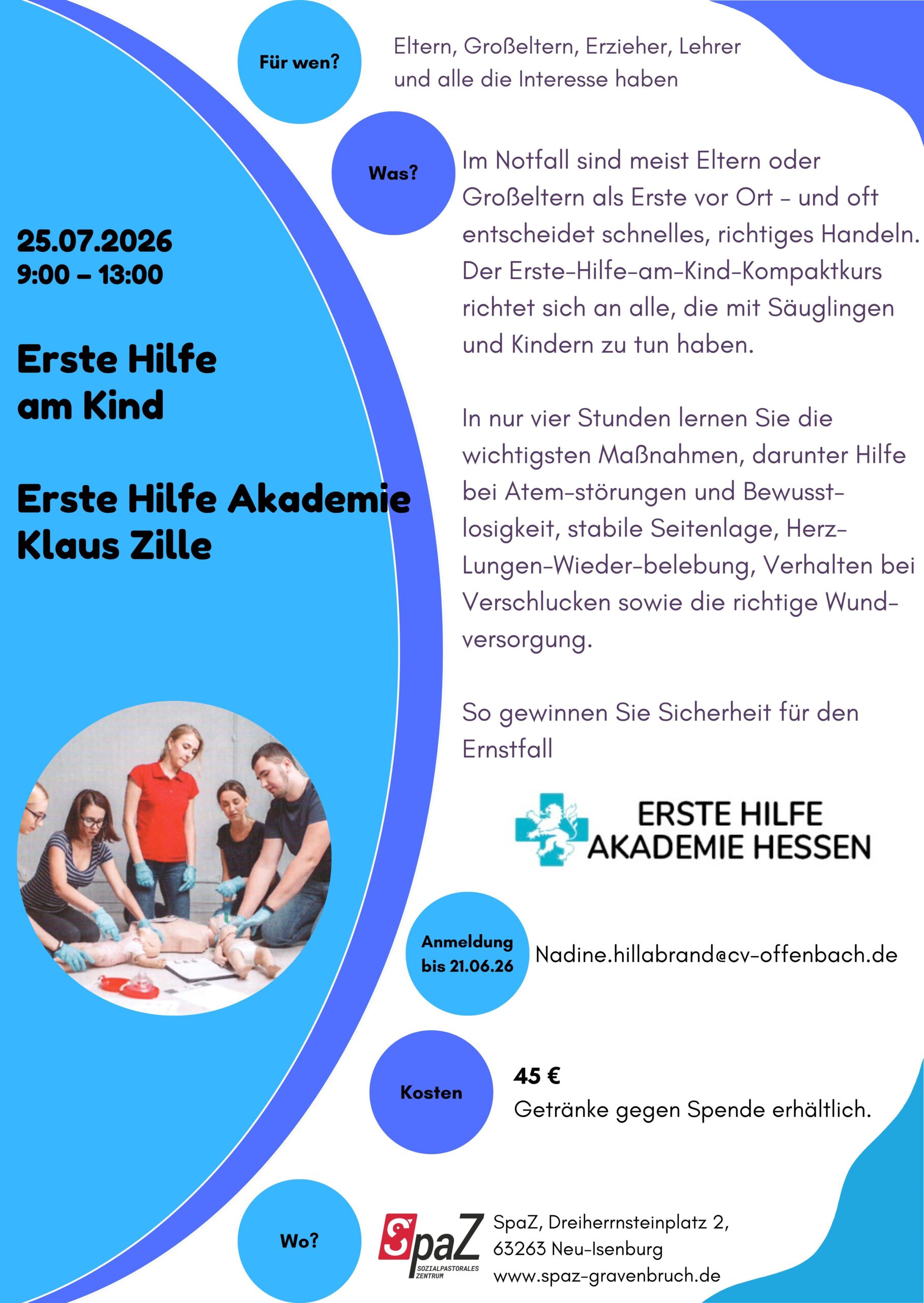 Im Notfall zählt oft jede Sekunde. Ob bei einem Unfall am Arbeitsplatz, einem Notfall mit Kindern oder einer plötzlichen Bewusstlosigkeit – schnelles und richtiges Handeln kann Leben retten. Genau aus diesem Grund bietet die Erste Hilfe Akademie Klaus Zille in Kooperation mit dem SpaZ Neu-Isenburg im Sommer 2026 zwei wichtige Erste-Hilfe-Kurse an.